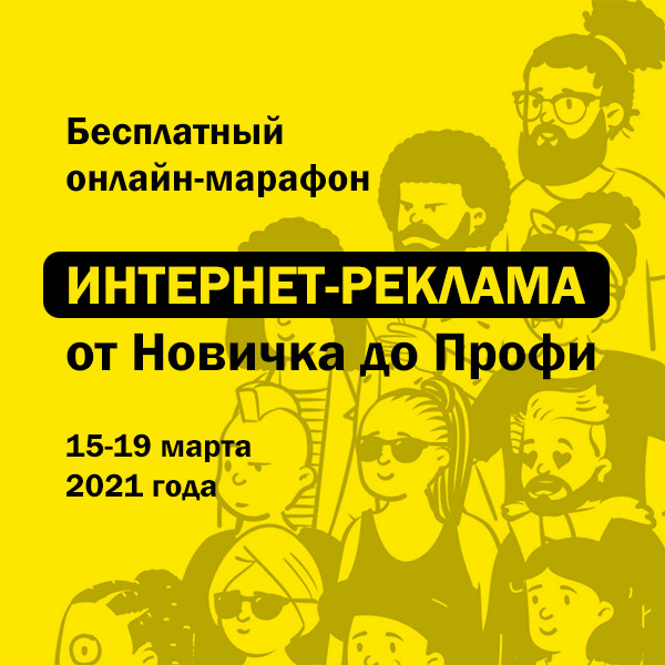 Обзоры | Онлайн-марафон «Интернет-реклама от новичка до профи»с 15 по 19 марта 2021 года состоится прямая онлайн-трансляция с актуальными докладами экспертов и кейсами рекламных кампаний. Методы создания крутых креативов с высочайшим CTR, продвинутые способы таргетинга целевой аудитории, техники повышения эффективности рекламы и экономии бюджета, функции автоматизация рекламы и многое другое. |