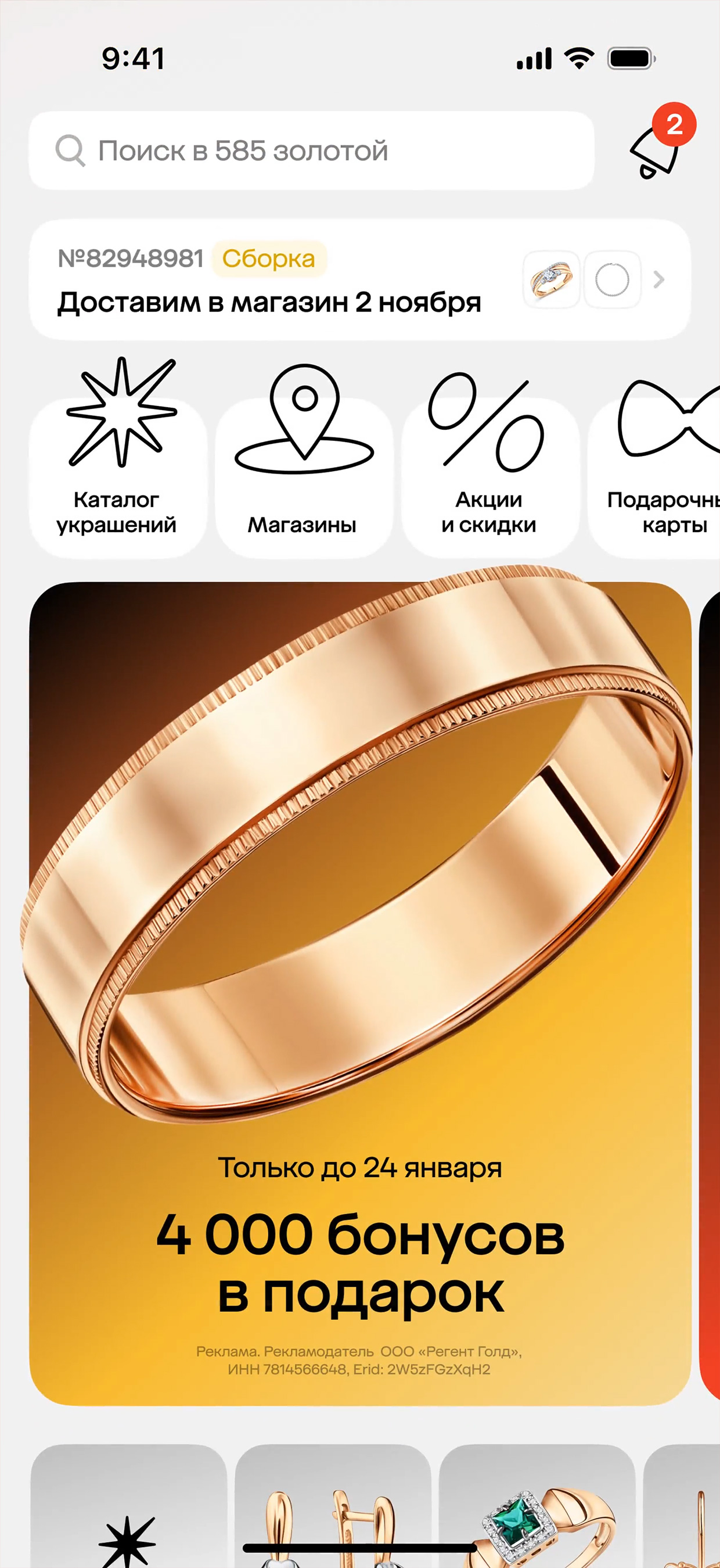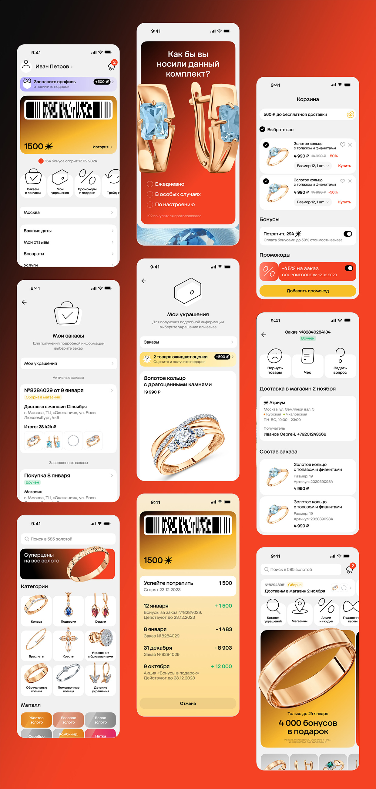 Мобильное приложение для клиентов ювелирной сети «585 Золотой» обладает всем современным функционалом.