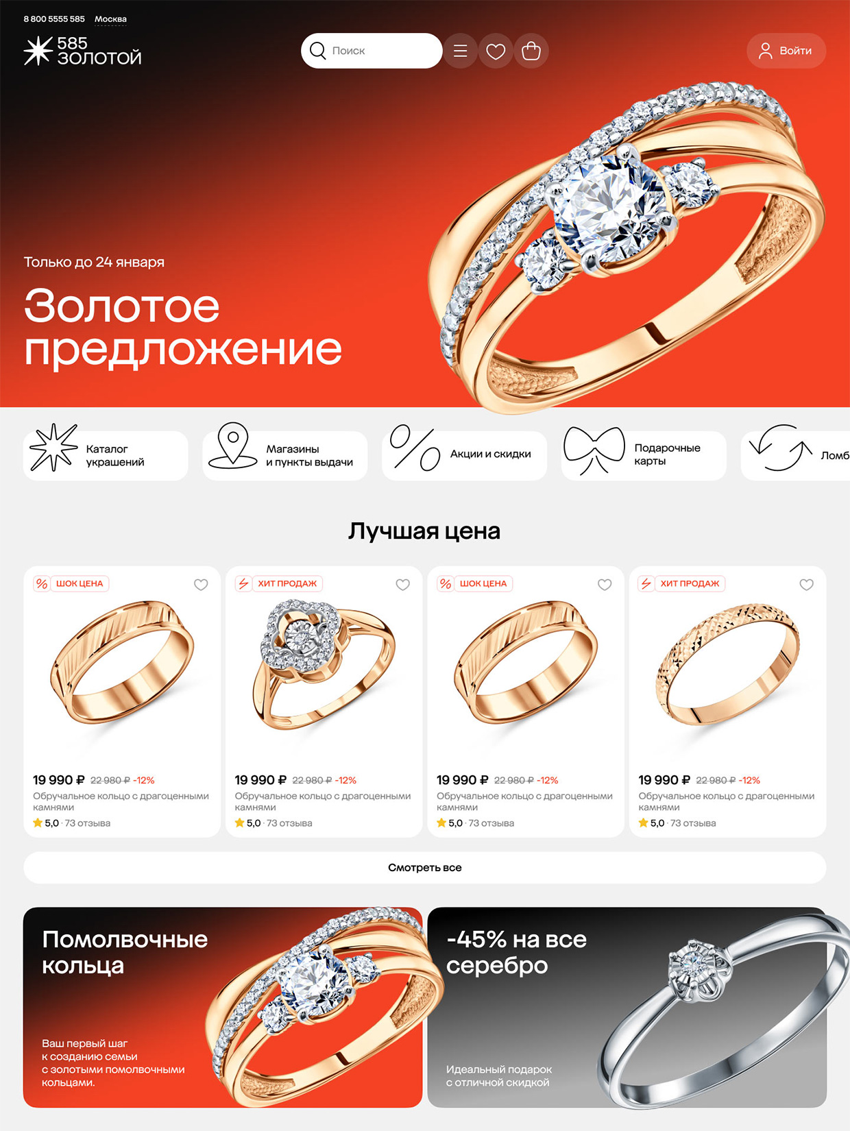 Главная страница обновлённого сайта «585 Золотой» рассказывает обо всём многообразии украшений и показывает выгодные предложения, скидки, акции и персональные рекомендации — пользователь сразу погружается в ассортимент.