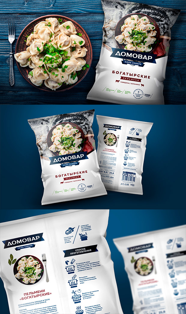 В то же время только что приготовленные сочные горячие пельмени, помещенные в самый центр, согревают и вызывают зверский аппетит. Общую картину завершает бросающиеся с первого взгляда в глаза логотип и слоган, которые бескомпромиссно делят лицевую сторону упаковки на две составляющие: информационную и имиджевую.