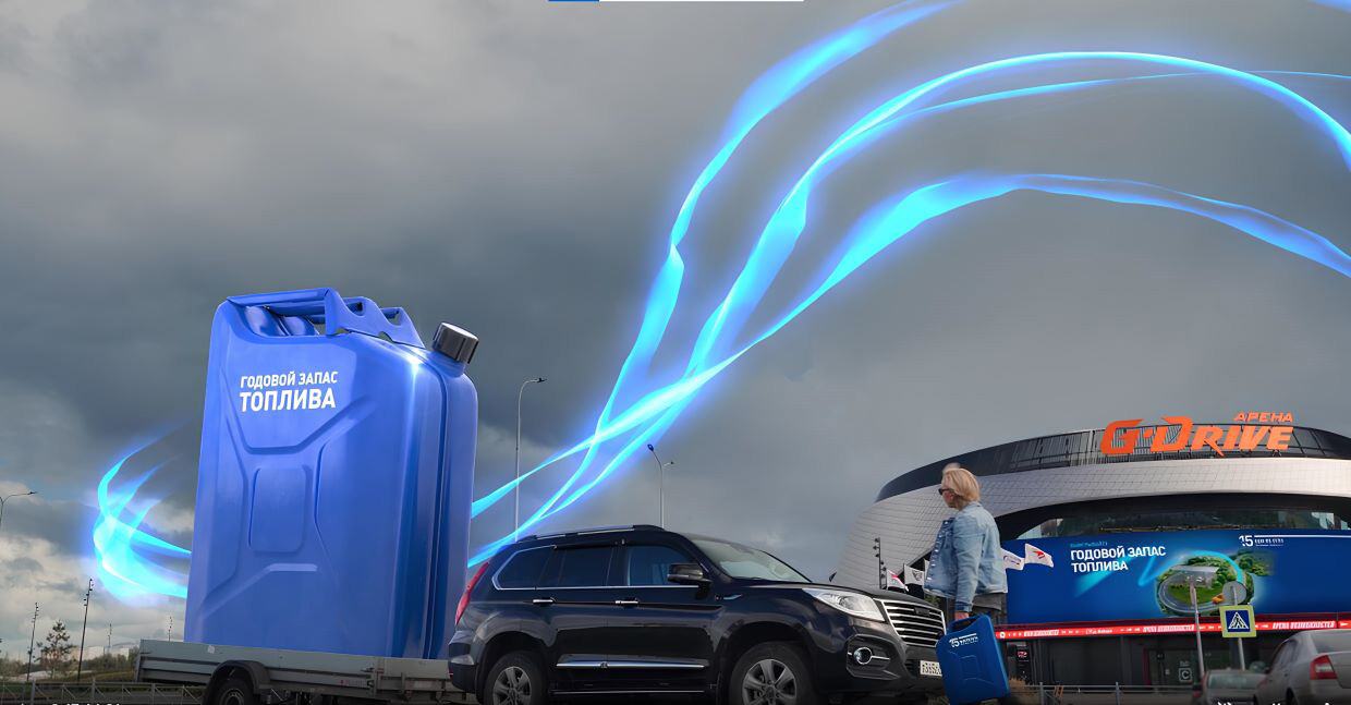 Затем художник по компьютерной графике отрисовал главные визуальные элементы роликов — огромные канистры, которые победители акции увозят с собой домой — классный образ годового запаса топлива, который делает ролик визуально понятным и привлекательным.