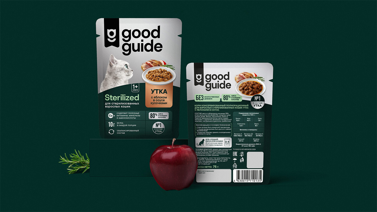 Для этикетки был создан элегантный и выразительный концепт, в центре которого на равных с изображением животного работает food-фото. Ракурс питомца создает иллюзию его взаимодействия с едой. Глубокие темные цвета и актуальная верстка добавляют премиальности образу.