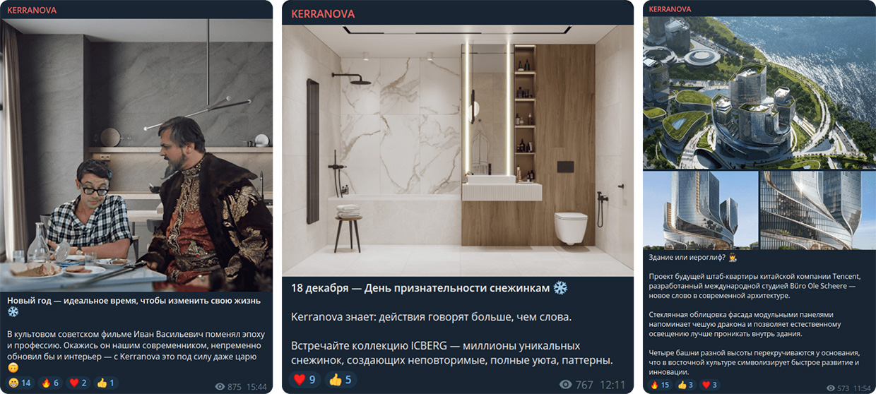 - Вовлечённость — для повышения активности аудитории через конкурсы и розыгрыши. Например, пользователям предлагается делиться своими проектами, выполненными с использованием керамогранита Kerranova. Такая стратегия не только стимулирует чувство причастности, но и укрепляет лояльность аудитории.