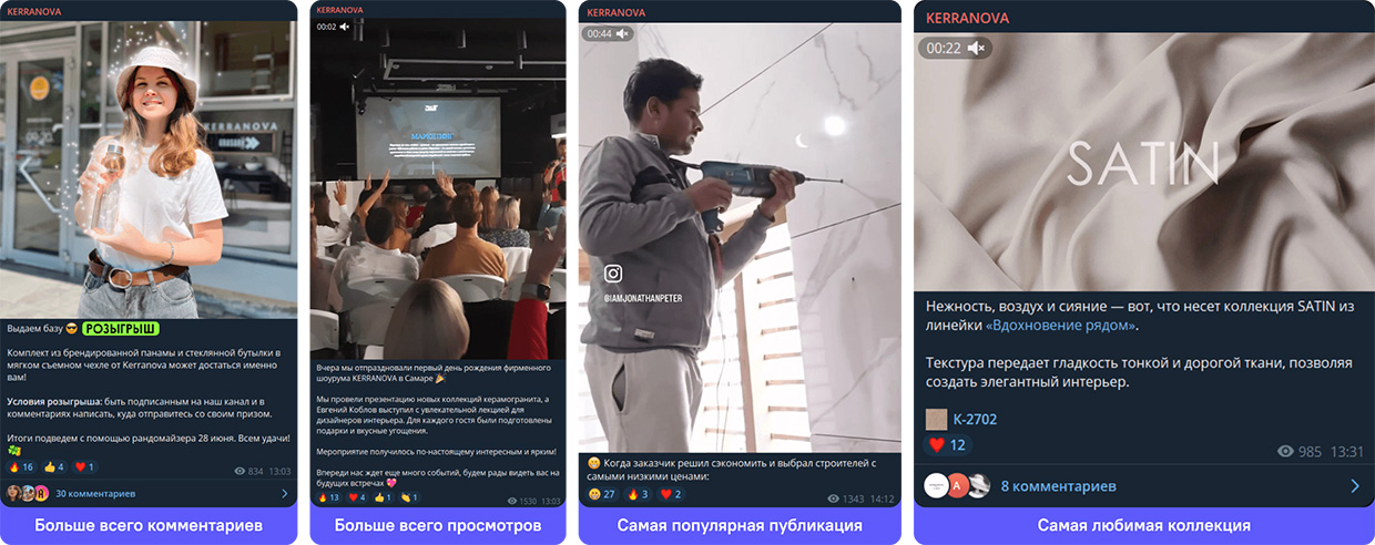 В отличие от конкурентов, JetStyle активно внедряли в канал KERRANOVA динамичный контент, включая видео и GIF-анимацию, что помогло разнообразить ленту и привлечь внимание широкой профессиональной аудитории — архитекторов и дизайнеров интерьеров.