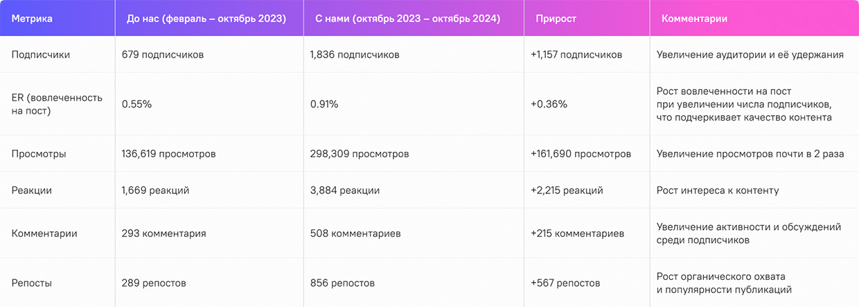 До участия агентства (с февраля по октябрь 2023 г.) охваты составили 136619 просмотров. После начала работы JetStyle (с октября 2023 по октябрь 2024 г.) они выросли до 298309 просмотров. Прирост составил +161690 просмотров, что почти в два раза превышает показатели предыдущего периода и свидетельствует об успешной реализации стратегии.