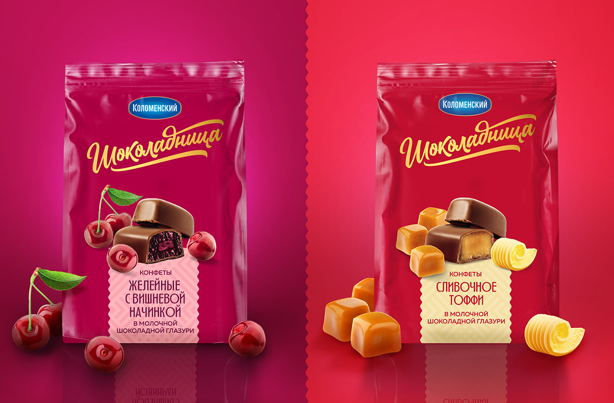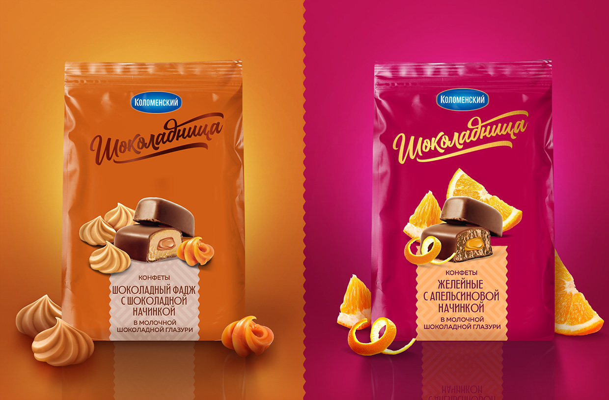 Было также сделано усиление брендинга: логотип «Шоколадница» увеличен, очищен от близко расположенных элементов, вынесен в верхнюю часть упаковки. Логотип производителя «Коломенский» также получил акцентную позицию и стал «знаком качества».