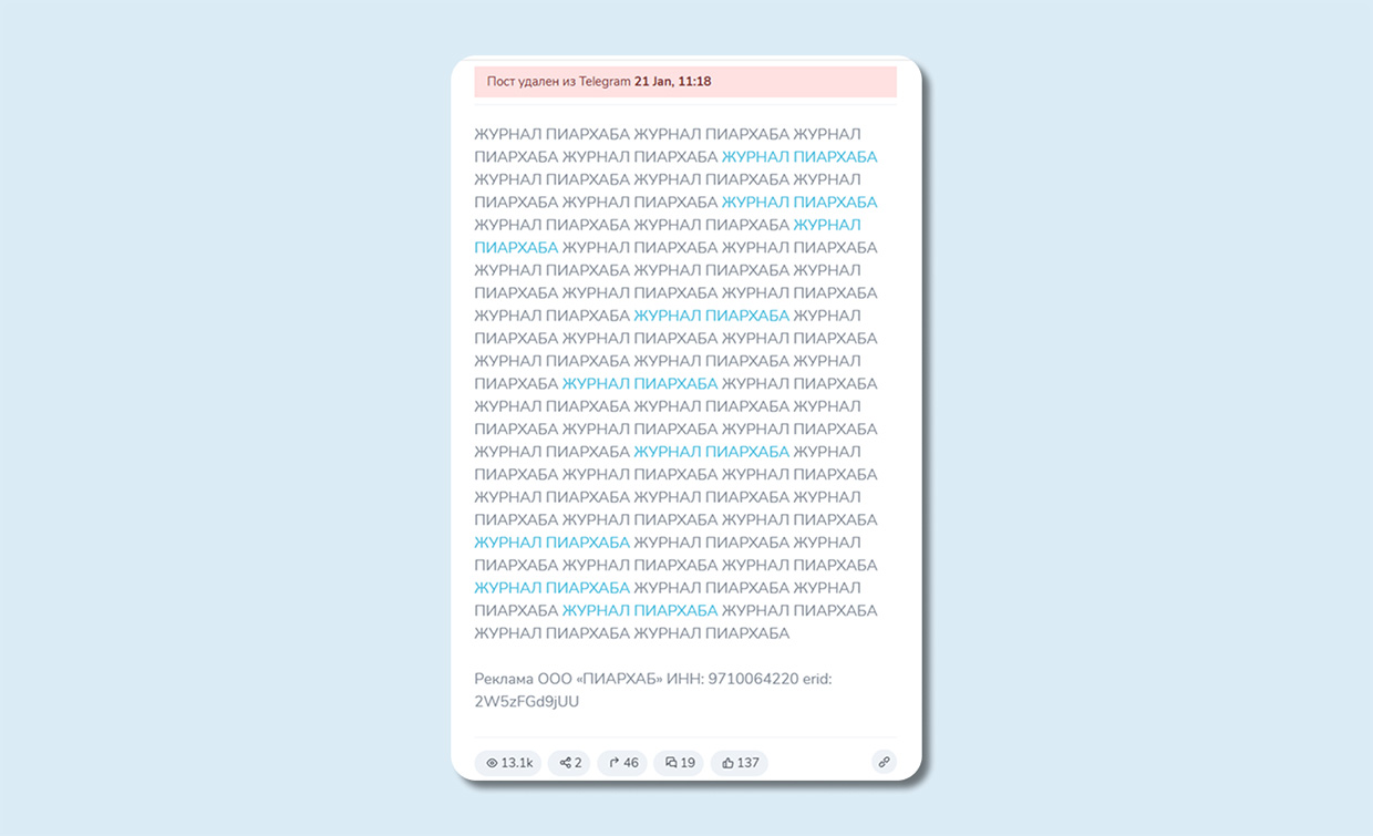 Креатив для посева у Лобушкина. Чтобы выделиться в ленте, специалисты сделали рекламный пост с повторяющейся фразой «ЖУРНАЛ ПИАРХАБА». Дизайнеры повторили её 20 раз, а в часть фраз вставили ссылку на канал. Такой формат сработал как мем: он не только привёл подписчиков, но и получил органические упоминания от других пиар-каналов. Креативом поделились целых 46 раз.