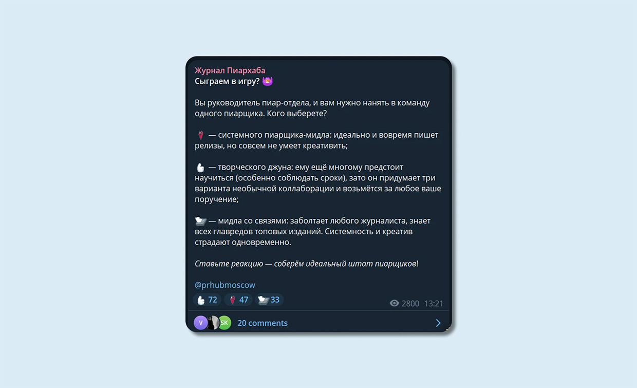 Был создан интерактивный пост-игра: задаётся типичная для руководителя PR-отдела ситуация и предлагается выбрать, кого из кандидатов он бы взял в команду. Формат зашёл: читатели спорили, делились мнениями и репостили. В итоге удалось собрать 2800 просмотров вместо предыдущих 1200—1500.