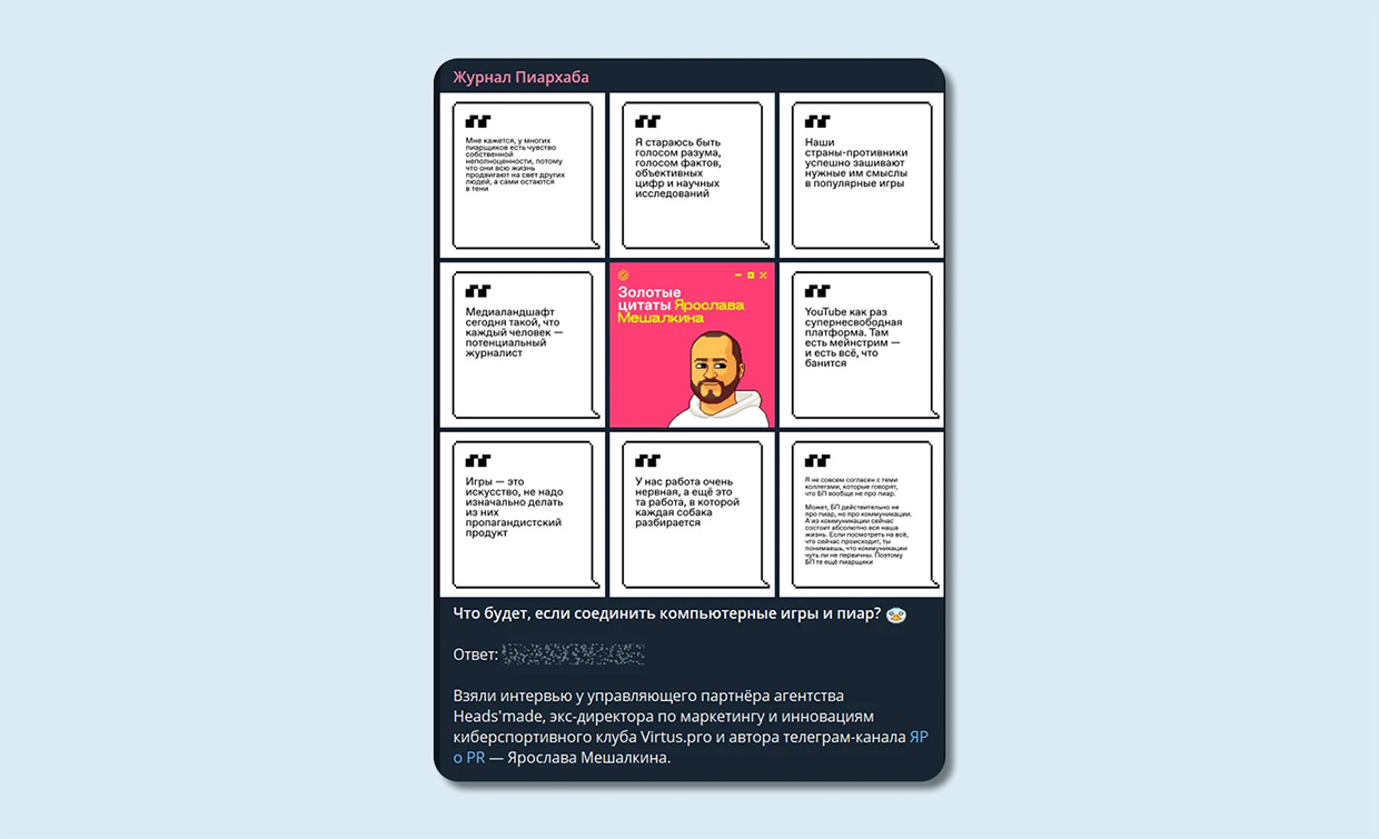 Чтобы привлечь ЦА и поддержать формат комьюнити, агентство начало публиковать интервью с известными пиарщиками индустрии — редакторы искали экспертов с активными телеграм-каналами и предлагали им стать героями публикаций. От постов-интервью ожидался виральный эффект.