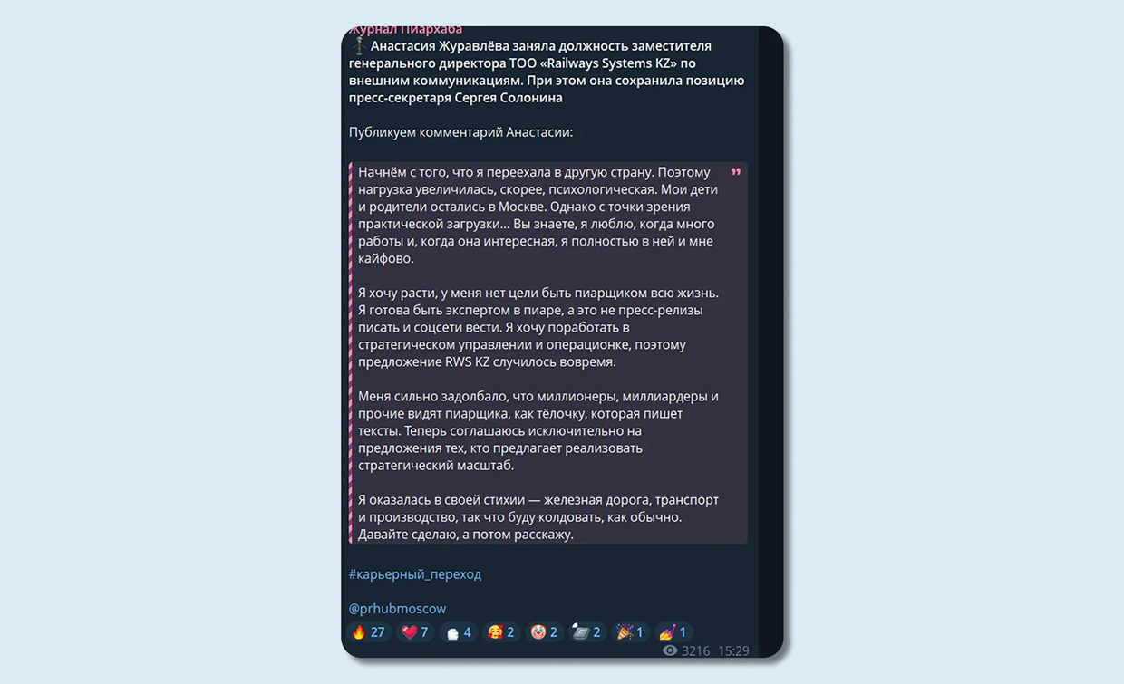 Ещё один успешный эксперимент — рубрика о карьерных переходах пиарщиков и журналистов. Авторы рассказывали о том, кто куда ушёл, чем теперь занимается и как с ним можно работать. Для PR-сообщества это релевантно. Каждый собирает свою базу: журналистов — для питчей, пиарщиков — для коллабораций.