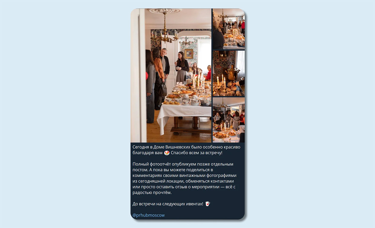 Чтобы ещё быстрее увеличить вовлечённость аудитории и экспертность «Пиархаба», команда запускала офлайн- и онлайн-мероприятия для пиарщиков. Темы были самые разные: как увеличить медиаиндекс, о пиаре в недвижимости, девелопменте и бьюти-сфере. Формат — живое общение без продающих слайдов. Канал приглашал спикеров, собирал актуальную повестку, выводил обсуждения из чатов в реальность.