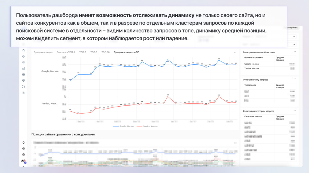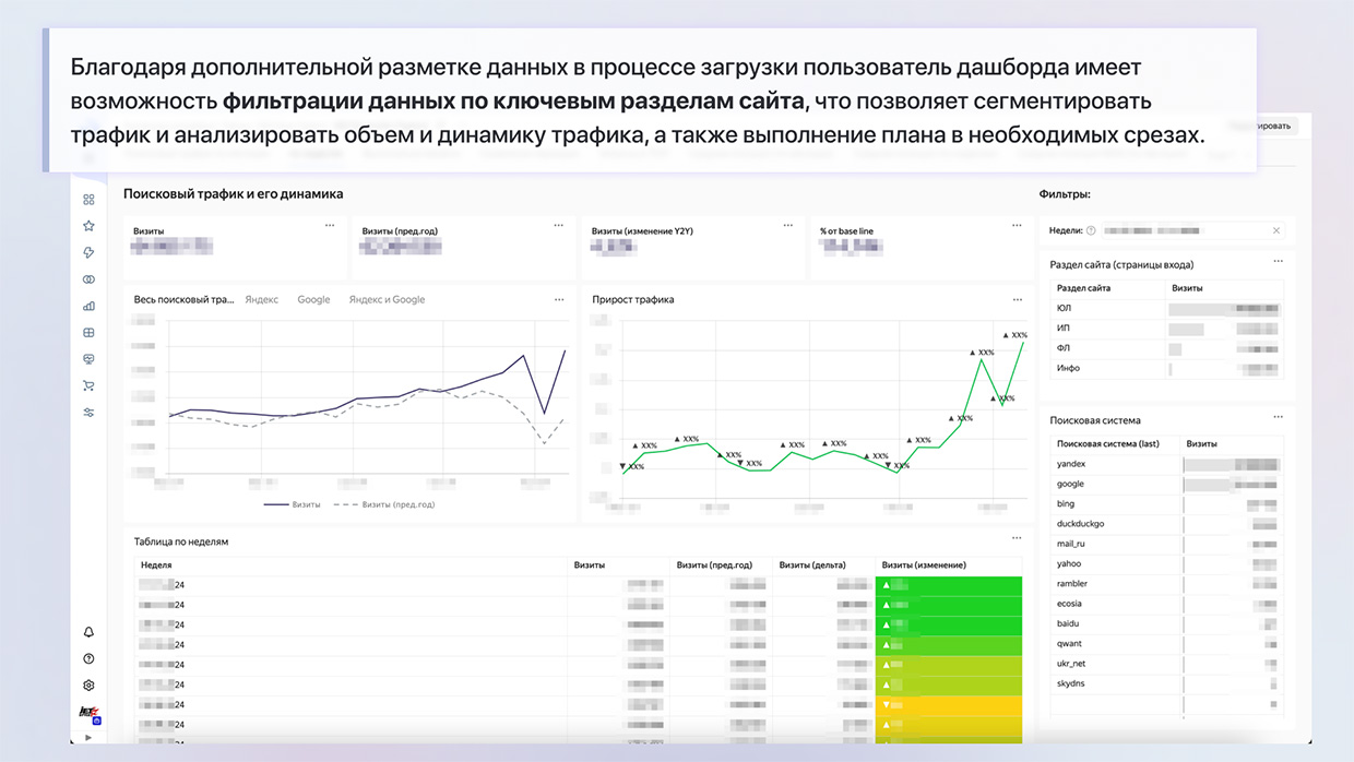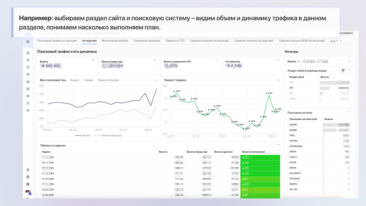 - Мониторинг ключевых метрик SEO: позволяет быстро отслеживать динамику органического трафика и видимость сайта по ключевым показателям (поисковая система, группа запросов, смысл поискового запроса).