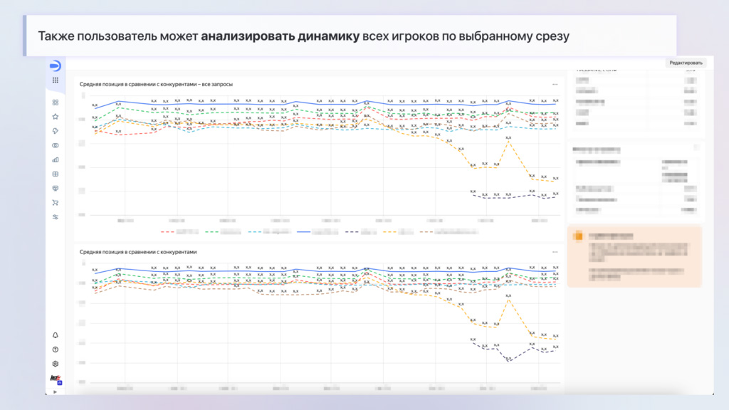 - Идентификация точек роста и проблемных зон: дашборд показывает динамику роста по группам запросов и позволяет оперативно выявлять резкие падения позиций по отдельным группам, что дает возможность своевременно принимать меры.