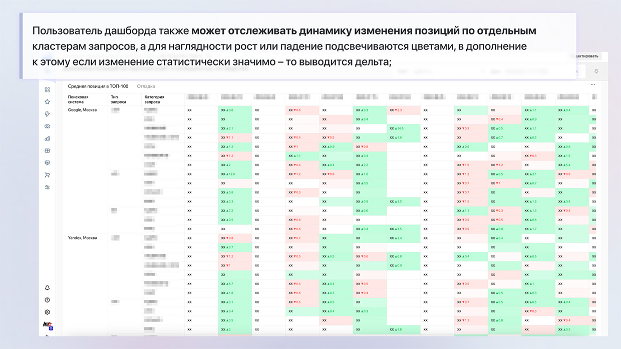 - К моменту работы над вкладкой с позициями заказчик уже получил рабочий инструмент для отслеживания динамики поискового трафика. В процессе разработки вкладка с позициями также претерпела ряд изменений и улучшений.