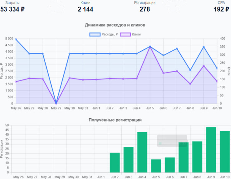 Кампания во ВКонтакте также принесла целевые регистрации, хотя и по более высокой цене.