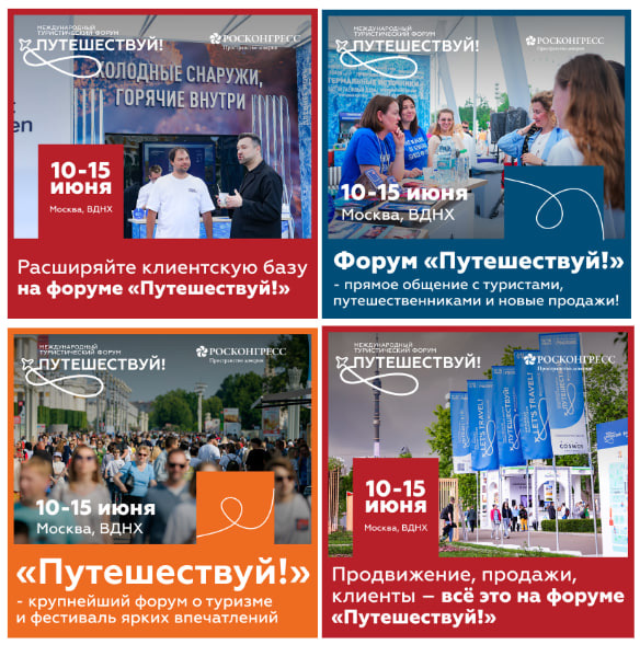 | ВКонтакте | Подписчики сообществ конкурентных выставок (MITT, OTDYKH Leisure), участники групп по B2B-туризму. | Аудитории: Интересуются Бизнесом и инвестициями в туризме, Туризм + Бизнес (B2B). Объявление: «Ваш бренд на виду у 500 000 гостей! Продавайте турпродукты и находите клиентов на главном туристическом событии года. Оставьте заявку!» |