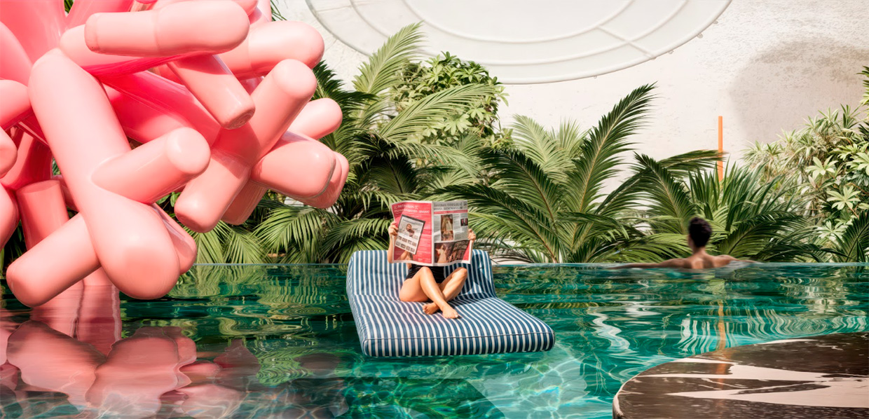 - Логотип и знак. Шрифтовое название дополнили графическим знаком — двумя переплетёнными буквами «V». Форма знака повторяет главный арт-объект комплекса: коралл в бассейне, что делает знак визуальной отсылкой к реальной среде.