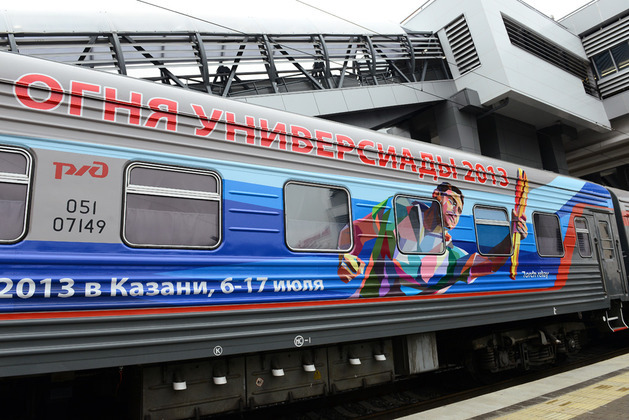 Специальный поезд Эстафеты огня Универсиады 2013 пройдет через города России: Москва, Казань, Санкт-Петербург, Нижний-Новгород, Самара, Екатеринбург, Новосибирск.