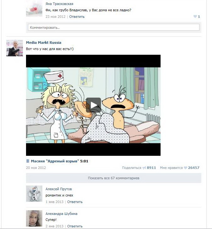Очень высокий уровень вовлеченности – около 500 000 лайков суммарно, сотни фраз «Спасибо, Media Markt!», несколько миллионов улыбнувшихся людей. Только в группе Media Markt Вконтакте каждый пост с новой серией Масяни принес около 20 000 действий.