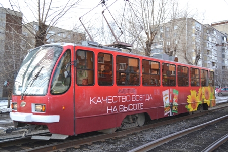 В качестве рекламоносителей выбраны одновагонные трамваи Екатеринбурга и Новосибирска. Яркий и простой рекламный макет со слоганом «Качество всегда на высоте» привлекает внимание потребителя и выделяется в общем потоке транспорта.