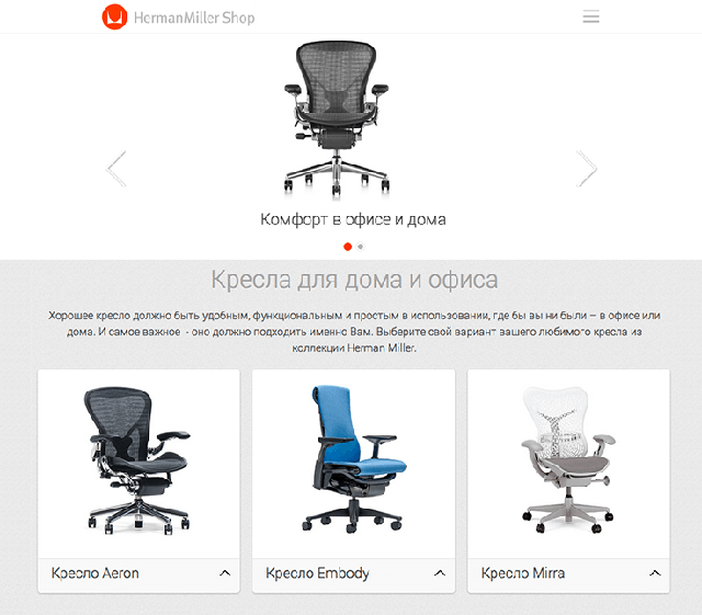 HermanMiller – знаменитый на весь мир бренд со 100-летней историей. Эргономичные кресла и столы занимают свои места в кабинетах руководителей и первых лиц многих компаний в самых разных отраслях. HermanMiller реализует продукцию высокого ценового сегмента – это эксклюзивная, дорогая мебель. Было важно создать с одной стороны презентабельный, а с другой, очень простой интернет-магазин: он должен позволять оформить покупку буквально в два клика – без длительных регистраций и заполнения множества полей.