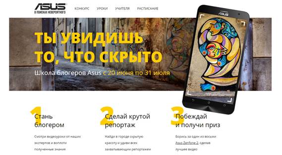 Темой конкурса стали необычные достопримечательности и арт-объекты городов России. Проект является своеобразной эстафетой по российским городам, ведь участникам конкурса, которые посмотрят обучающие уроки от известных блогеров из разных уголков России, предстоит снять собственное видео с рассказом об одном из малоизвестных мест своего города. Самые лучшие ученики школы блогеров получат ASUS Zenfone2 и свою минуту славы.