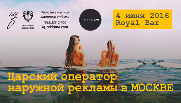 Рекламное агентство IQ предлагает мировым и российским брендам возможность охватить премиум-аудиторию с помощью размещения наружной рекламы крупного формата на территории Royal Bar. Также агентство готово оперативно организовать экспонирование автомобилей представительского класса.