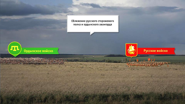 Вся содержательная часть ролика привязана к реальному пространству Куликова поля: конница выдвигается из-за холма, воины прячутся за пригорками.