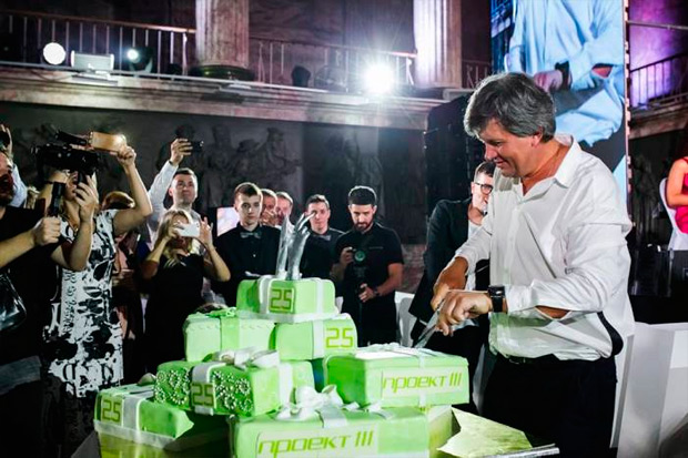 Под занавес вечера Андрей Дегтяренко разрезал гигантский торт, который выглядел как гора подарков.
