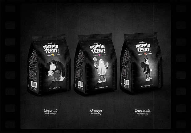 При разработке концепции торговой марки «Маффинтини» было решено сыграть на контрасте: “Джекил и Хайд” сделали маффины разноцветными, а в качестве оформления упаковки для яркого продукта создали черно-белый мир с мультипликационными персонажами в ретро-стиле, который выделялся бы среди разноцветных конкурентов и наглядно подчеркивал УТП.
