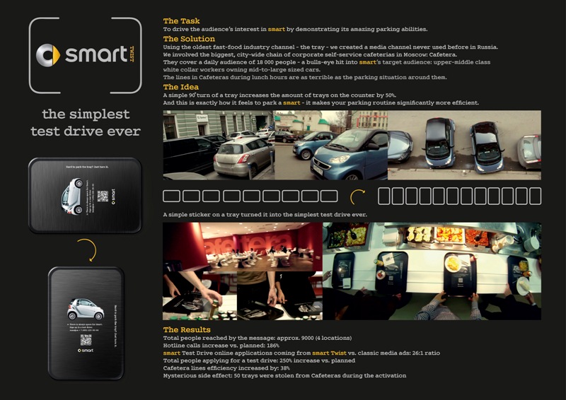 Мы заметили, что простой поворот подноса на 90 градусов может увеличить количество подносов на линии раздачи на 50%. И это все равно, что припарковать smart. Простой стикер на подносе позволил участникам пройти простейший тест-драйв — эффект от легкой парковки smart виден сразу, на ленте раздачи.