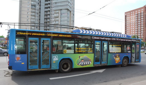 В Санкт-Петербурге «добрые» троллейбусы и трамваи работают уже более двух лет. Изначально проект был реализован «ПTV» и СПб ГУП «Горэлектротранс», а этой зимой в него включились районные ГИБДД. Информационное воздействие по теме соблюдения ПДД осуществляется комплексно - путем художественного оформления подвижного состава и информирования населения через медиаканал в общественном транспорте. «Добрый» транспорт видят и взрослые, и дети (6+).