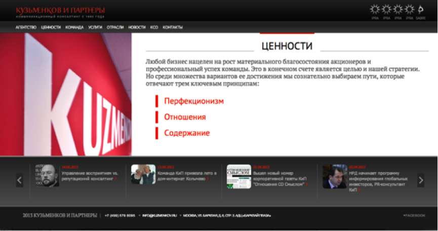 Внизу главной страницы располагается мини-слайдер с другими актуальными новостями агентства. Разделы сайта: Агентство, Ценности, Команда, Услуги, Отрасли, Новости, КСО, Контакты.