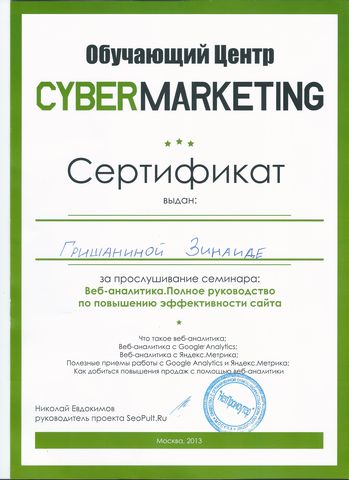 Зинаида Гришанина окончила Сибирский Университет Потребительской Кооперации по специальности «Реклама» в 2007 году. К команде SmartMedia присоединилась в 2011 году в качестве SEO-копирайтера, в 2013 году выросла по карьерной лестнице до SEO-аналитика, в 2014 стала сертифицированным веб-аналитиком. Работала с такими крупными клиентами, как: ОН КЛИНИК, НИАРМЕДИК, Элькар и другими.