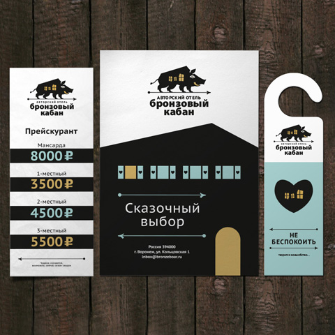На создание логотипа и фирменного стиля дизайнеров вдохновило само название отеля «Бронзовый кабан» - исторически, первой сказки Ганса Христиана Андерсена, переведенной на русский язык и напечатанной в дореволюционной России.