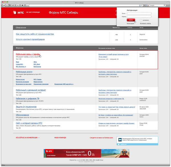 В 2009 KINETICA создала форум «МТС Сибирь», обслуживанием которого занимается и по сей день. В 2013 перед агентством уже во второй раз встала задача по редизайну форума. Забегая немного вперёд, этим дело не закончилось — потребовалось изменение функционала. Обновлённая версия сайта находится по адресу http://forum.sib.mts.ru/