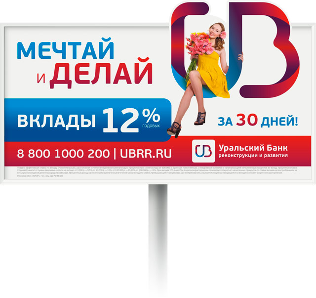 Рекламное агентство Bradberry (Екатеринбург) разработало генеральную визуальную концепцию для крупнейшего на Урале банка - Уральского банка реконструкции и развития (УБРиР). Реклама была запущена весной этого года в рамках масштабной кампании «Мечтай и делай», и анонсировала выход на рынок новых банковских продуктов.