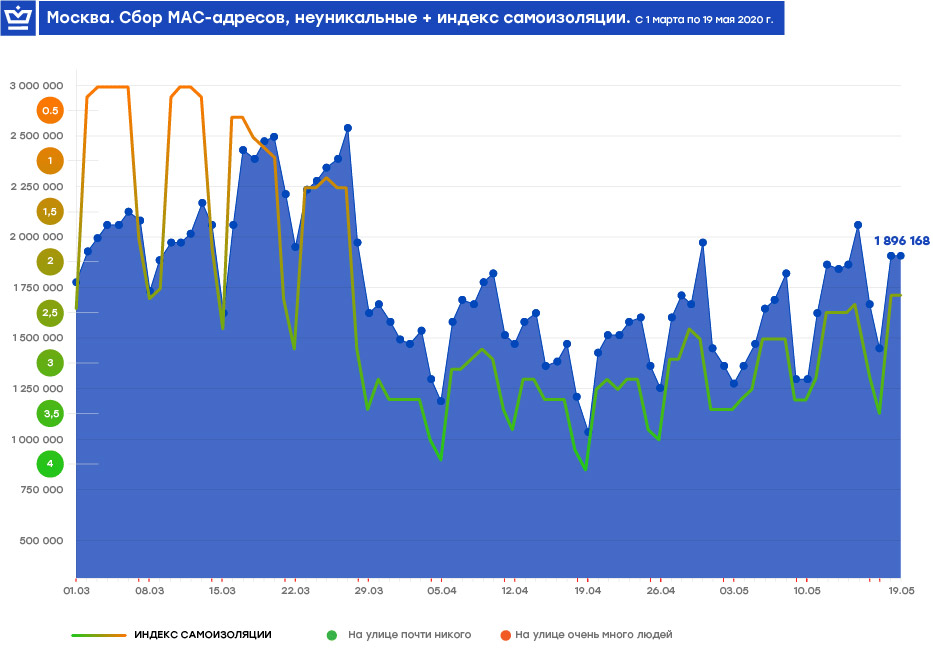 Рост OTS и уникальных MAC-адресов стал особенно заметен с 12 мая, когда было объявлено о частичном снятии ограничений. Например, уже 19 мая в Москве на медиафасадах и суперсайтах было собрано 435 тысяч уникальных и 1,8 млн неуникальных MAC-адресов.