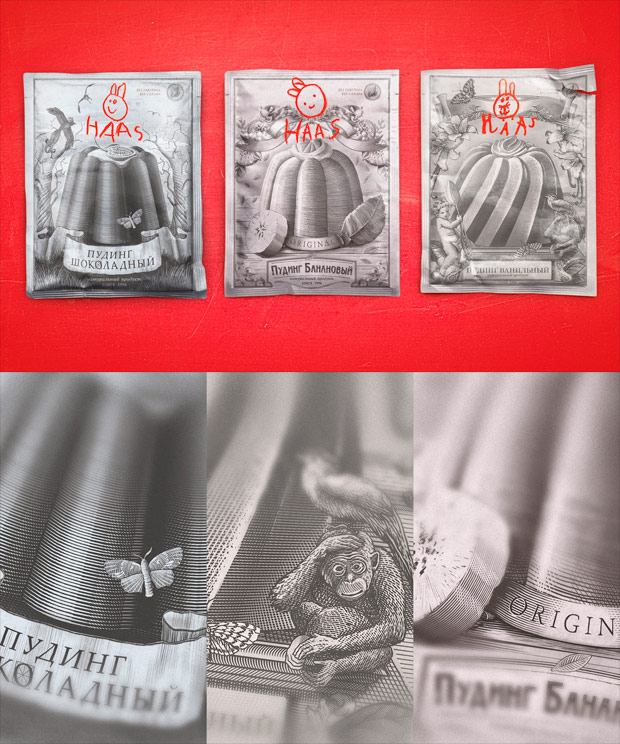 «Мы попросили детей 3-6 лет нарисовать зайцев (а именно заяц изображен на корпоративном логотипе HAAS) и разместили их творчество на упаковке. При этом остальные её элементы выполнены в серьезном стиле гравюры, которая обрамляет и подчеркивает «шедевры» маленьких художников», — говорит творческий директор Depot WPF Алексей Фадеев.