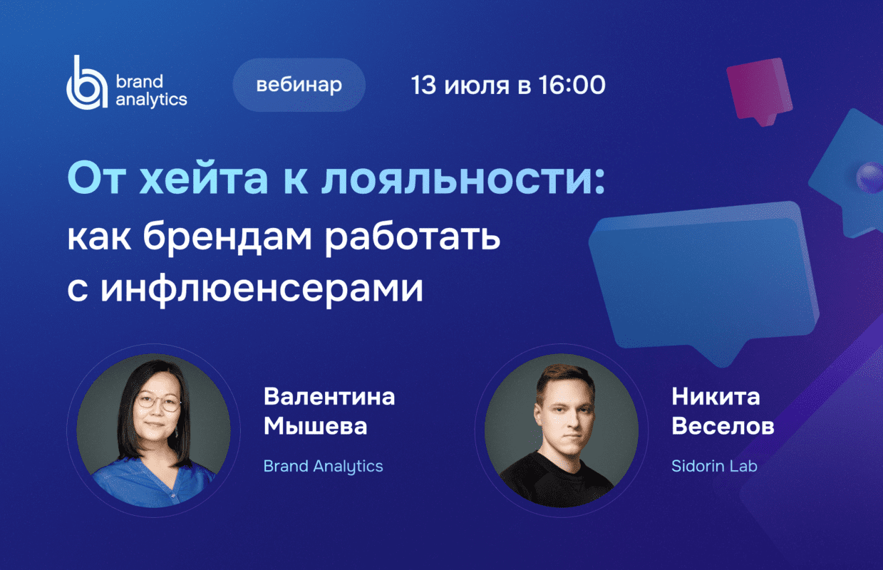 13 июля на вебинаре эксперты Brand Analytics расскажут о работе с инфлюенсерами: как искать лидеров мнений, которые будут рекомендовать продукт, обращать хейтеров в последователей и увеличивать охват аудитории.