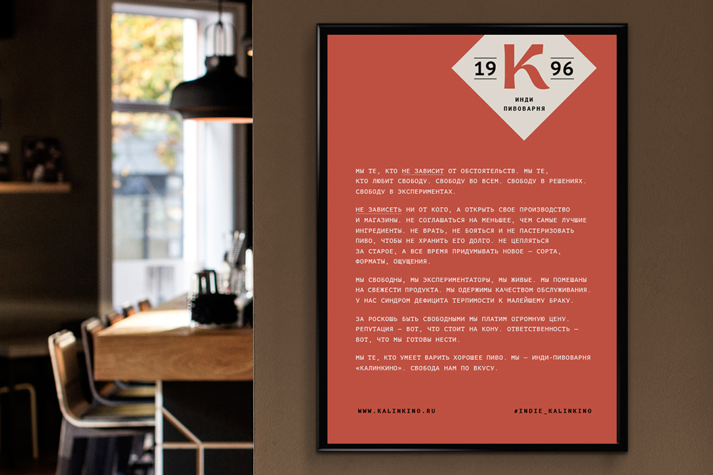 Независимость — это свобода действий, отсутствие рамок во многих вопросах. Слоган: «Свобода по вкусу» имеет двойное значение. В прямом смысле «Калинкино» свободны экспериментировать со вкусом пива, равно как и свободны варить традиционные сорта. И в переносном — свобода как главная ценность бренда.