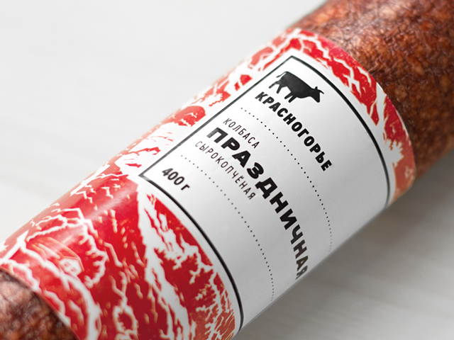 При ближайшем рассмотрении в мясных волокнах угадываются силуэты ферм, деревушек, Уральских гор и пасущегося у их подножия скота. Так дизайнеры связали концепцию упаковки с названием, добавили образу интересных деталей, говорящих не только о качестве сырья, но и об отношении производителей к своему делу.