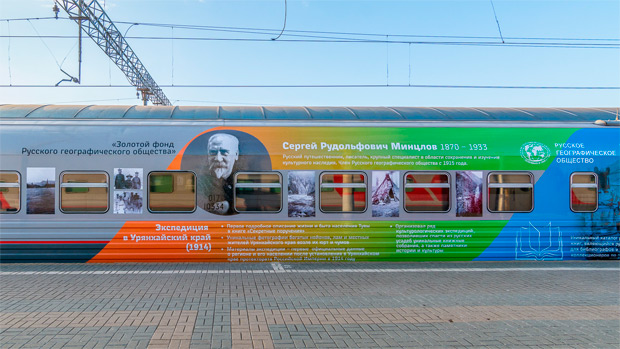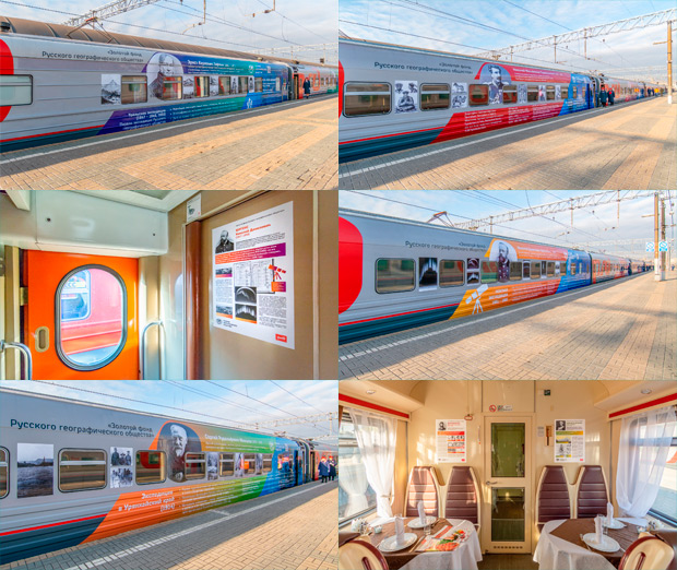 В ноябре на Ярославском вокзале Москвы состоялась презентация уникального состава – поезда дальнего следования, оформленного материалами экспозиции «Золотой фонд Русского географического общества». Брендированный поезд курсирует по маршруту Москва – Владивосток.