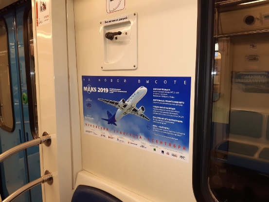 В августе ОАО «Авиасалон» провел рекламную кампанию Международного авиационно-космического салона МАКС-2019 с помощью оператора Московского метрополитена Nebo.digital на стикерах и видеоэкранах в вагонах столичной подземки.