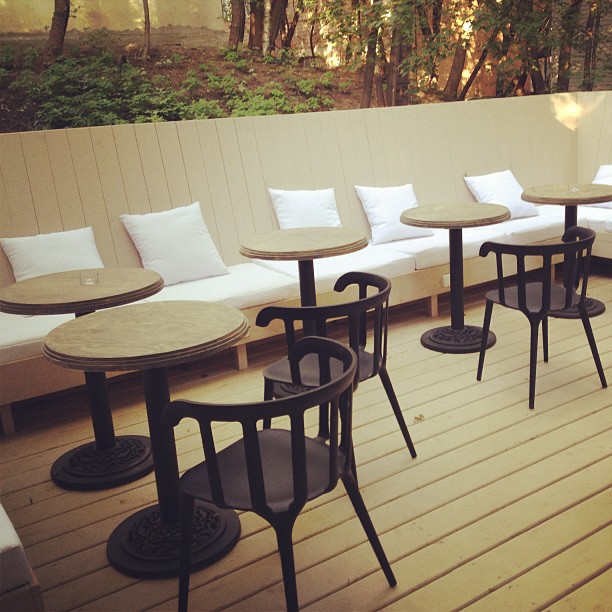 Одна из особенностей кафе – открытая терраса с мягкими белоснежными диванами, которые спрятались под тенью деревьев. Такое решение увлекает гостей в легкую атмосферу загородной кухни на открытом воздухе.