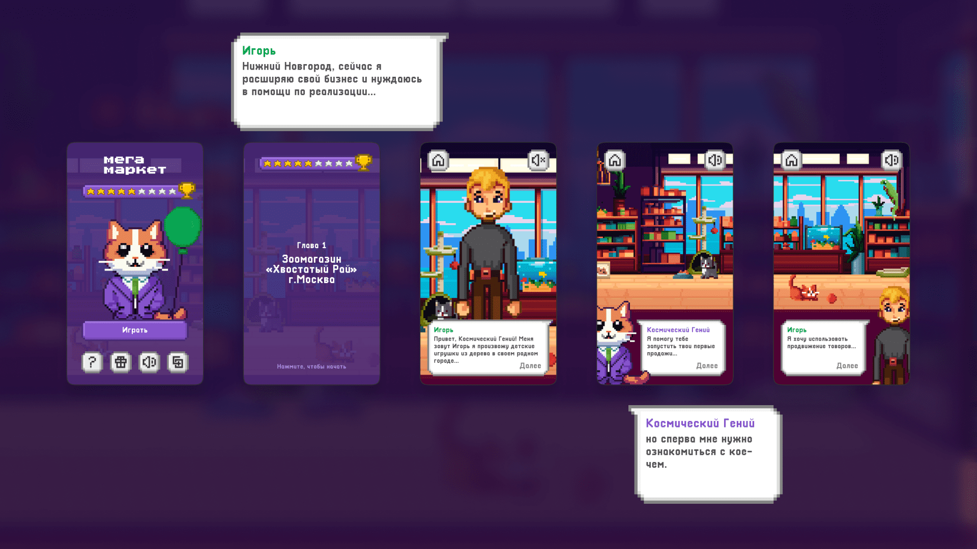 От Мегамаркета взяли визуальный сеттинг, брендирование и базу знаний. В качестве визуального стиля команда маркетплейса выбрала пиксель-арт — ностальгичный, придающий игре не слишком серьёзный флёр инди-студий.