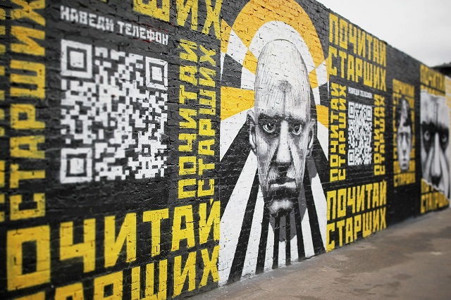 На фоне стены уже делают фото посетители Винзавода — их легко найти по хэштегу #почитайстарших