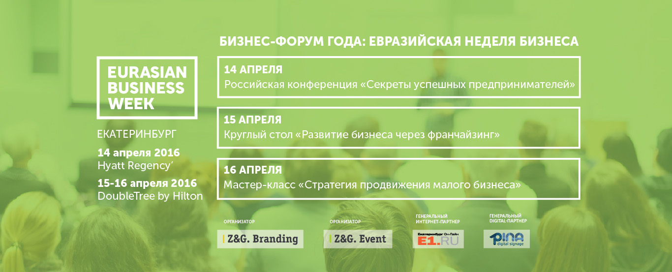 14-16 апреля состоится бизнес-форум «Евразийская Неделя Бизнеса 2016» («Eurasian Business Week 2016») в Hyatt Regency и DoubleTree by Hilton, при поддержке Министерства экономического развития РФ.
