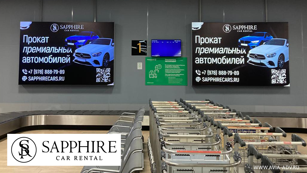 Кампания Авиа Адв, специализирующаяся на размещении рекламы в аэропортах и самолетах, сообщает о запуске новой рекламной кампании премиального проката автомобилей SAPPHIRE в аэропорту Пашковский (г. Краснодар).