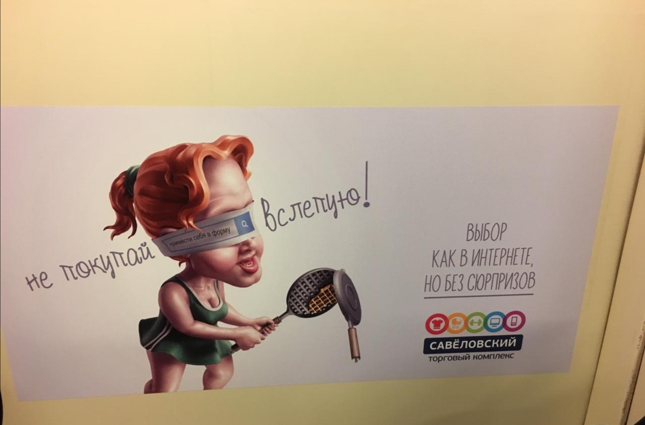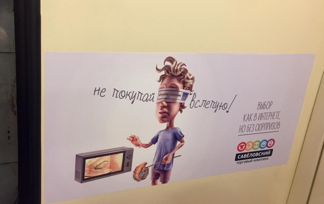 Рекламная кампания «Не покупай вслепую» для ТК «Савеловский» размещается на стикерах в вагонах столичной подземки на Серпуховско-Тимирязевской линии. Данная линия метро выбрана исходя из места расположения торгового центра.